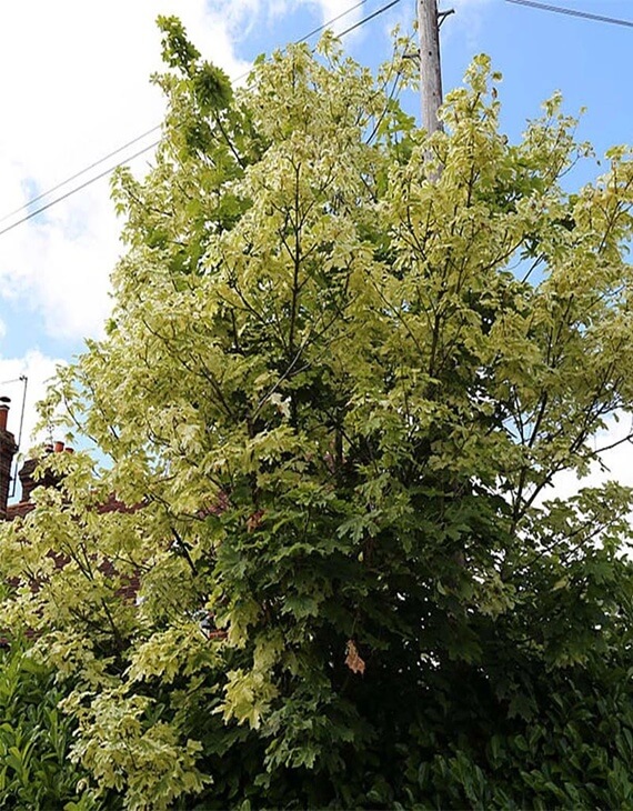 Au printemps, Acer platanoides Drummondii développe de grandes feuilles palmées, vert tendre, bordées d’un liseré blanc crème très régulier. Cette coloration stable conserve son éclat tout au long de la saison, sans brûler au soleil modéré. En automne, le feuillage évolue vers des teintes jaune clair, renforçant encore l’effet décoratif de l’arbre.