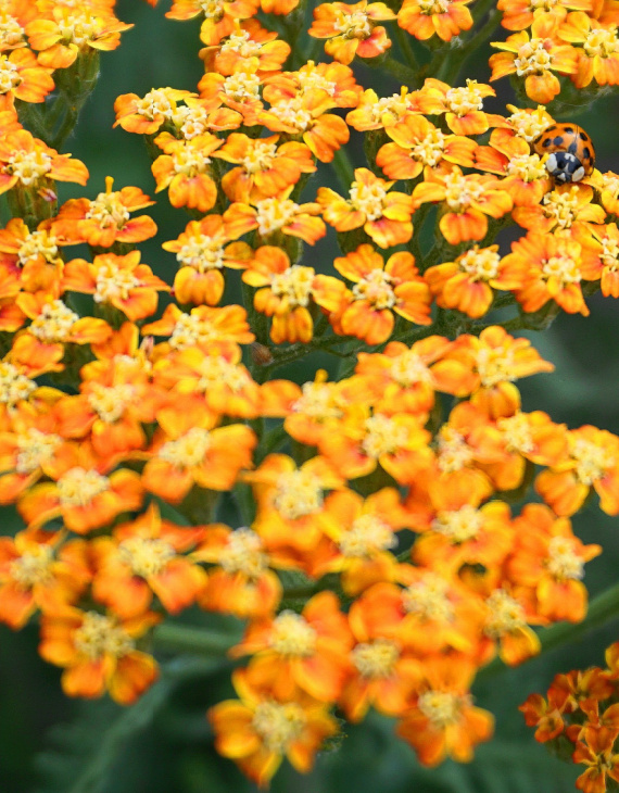 Dès la fin du printemps, Achillea millefolium ‘Terracotta’ produit des inflorescences plates de couleur orange cuivré, qui se patinent progressivement en jaune doux et en crème. Cette floraison généreuse et prolongée, perchée sur des tiges dressées atteignant 60 à 80 cm de hauteur, attire les abeilles et les papillons, favorisant ainsi la biodiversité au jardin.