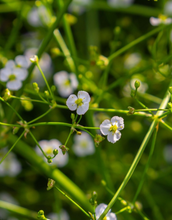 Le Plantain d’eau présente de grandes feuilles ovales à elliptiques, d’un vert intense, portées par de longs pétioles. Ces feuilles émergent en rosette depuis un rhizome robuste. En été, entre juin et août, s’élèvent des hampes florales ramifiées, pouvant atteindre jusqu’à 1 m de hauteur. Ces tiges fines portent une multitude de petites fleurs délicates à trois pétales, de couleur rose pâle à blanc lavé de mauve, légèrement parfumées.