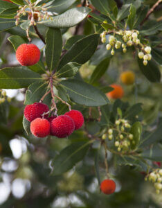 Ses feuilles ovales, d’un vert sombre, créent un contraste saisissant avec ses fleurs en clochettes blanches ou légèrement rosées qui apparaissent en automne. Ces fleurs cohabitent souvent avec les arbouses, des fruits rouges à la texture granuleuse et au goût acidulé, comestibles aussi bien par l’homme que par la faune locale.