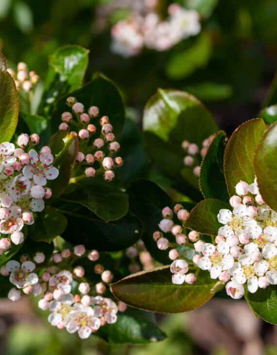 Le feuillage de l’Aronia melanocarpa est vert brillant au printemps et en été. À l’automne, il se transforme en un magnifique dégradé de rouge et d’orange, créant un spectacle coloré dans le jardin. En mai, l’arbuste se couvre de petites fleurs blanches en grappes, particulièrement mellifères et attrayantes pour les pollinisateurs. Les fruits noirs, qui mûrissent en août-septembre, sont riches en vitamines et en flavonoïdes, parfaits pour des jus, confitures ou séchés comme en-cas.