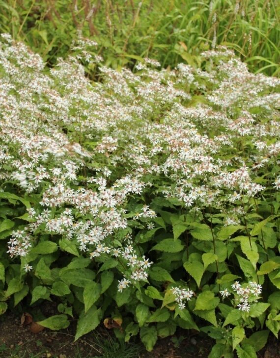 Avec une hauteur de 40 à 60 cm et une largeur de 50 à 70 cm, Aster divaricatus s’intègre parfaitement dans les massifs d’ombre partielle ou sous les arbres. Il se développe en touffes légères et aériennes, idéales pour donner du relief aux plantations d’ombre. Son feuillage vert foncé et ses tiges légèrement pourprées ajoutent un attrait supplémentaire même hors floraison.