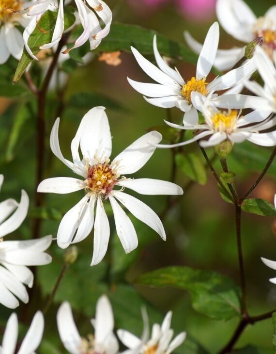 Aster divaricatus, aussi appelé aster des bois, est une vivace robuste qui illumine les sous-bois et les massifs ombragés avec ses petites fleurs étoilées blanches au cœur doré. Sa floraison légère et vaporeuse, de juillet à septembre, apporte une touche naturelle et romantique aux jardins ombragés. Cette variété attire les pollinisateurs et se marie harmonieusement avec des fougères, des hostas et d’autres vivaces d’ombre.