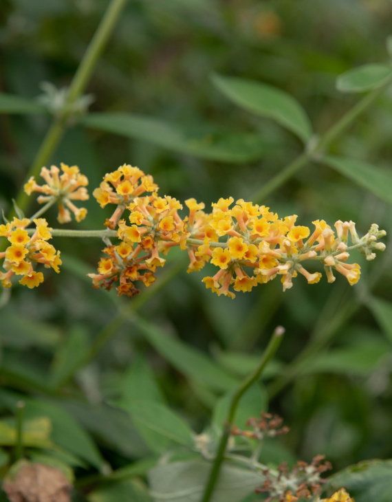 De juillet à septembre, le Buddleia ‘Sungold’ se couvre de grappes arrondies de petites fleurs jaune vif. Ces fleurs, au parfum délicat, s’épanouissent sur un feuillage vert-grisâtre légèrement duveteux, qui apporte une texture douce et lumineuse à votre jardin.
