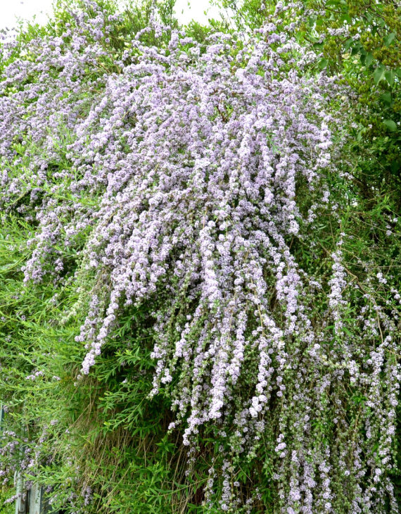 Ses longues branches arquées se couvrent de petites feuilles allongées, vert grisâtre, apportant une texture légère et élégante. À la fin du printemps et au début de l’été, des grappes de fleurs lilas apparaissent tout le long des rameaux de l’année précédente. Leur parfum doux attire irrésistiblement papillons et abeilles.
