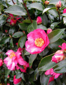 Le Camellia sasanqua est un arbuste persistant apprécié pour sa floraison automnale précoce et son feuillage élégant. Originaire du Japon, il se distingue par son port souple et léger et peut atteindre entre 2 et 4 mètres de hauteur pour 2 à 3 mètres de largeur. De novembre à janvier, il se pare de fleurs simples ou semi-doubles aux teintes délicates allant du blanc pur au rose tendre, parfois rehaussées d’un cœur doré. Son feuillage vert foncé lustré met en valeur la délicatesse de sa floraison.