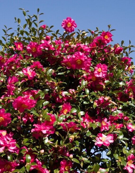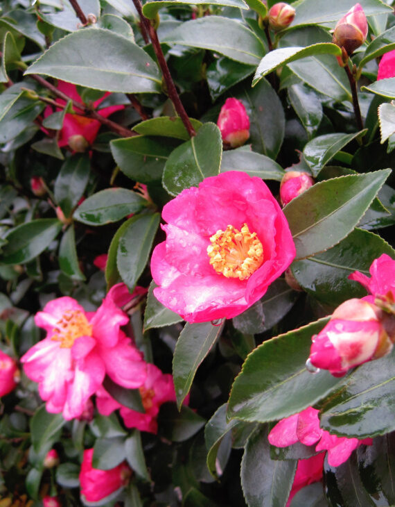 Le Camellia sasanqua séduit par sa floraison généreuse en période automnale, égayant les jardins lorsque peu d’arbustes sont en fleurs. Plus tolérant au soleil et à la sécheresse que le Camellia japonica, il s’adapte à divers environnements tout en conservant sa robustesse (jusqu’à -12°C). Son feuillage persistant assure une présence décorative tout au long de l’année, et ses fleurs délicatement parfumées attirent les pollinisateurs. Il se prête aussi bien à la culture en haies libres, en isolé ou en bac sur une terrasse.