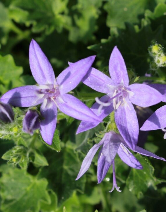 Campanula garganica, ou campanule de Gargano, est une vivace tapissante originaire d’Italie. Elle forme un tapis dense de feuillage vert tendre, surmonté d’innombrables étoiles bleu lavande de juin à août. Cette floraison généreuse crée un effet vaporeux et lumineux, idéal pour les rocailles, interstices de murets, bordures et jardinières. Grâce à son port bas et étalé, elle couvre rapidement le sol et s’avère parfaite comme couvre-sol fleuri.