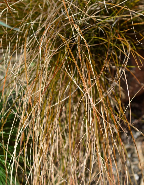 Carex testacea ‘Prairie Fire’ est une graminée vivace originaire de Nouvelle-Zélande, remarquable par ses teintes cuivrées, orangées à rouges en période chaude ou en plein soleil. Elle forme une touffe souple, dense et arrondie, dont le feuillage étroit, vert olive à la base, s’embrase en automne et en hiver. C’est une plante parfaite pour donner du mouvement et de la couleur aux scènes contemporaines, aux jardins secs ou aux potées.
