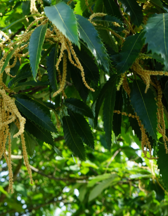 Le Castanea sativa, appelé également châtaignier commun ou arbre à châtaignes, impressionne par sa taille imposante et sa longévité remarquable. Cet arbre caduc, originaire d’Europe méridionale et d’Asie Mineure, forme une large couronne arrondie, parfaite pour créer des zones ombragées dans le jardin. Son feuillage dense et vert foncé vire au jaune doré en automne, ajoutant une touche chaleureuse à votre espace extérieur. On le rencontre fréquemment en France et l’Ardèche est la première région productrice de châtaignes.