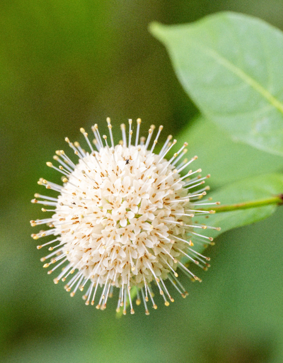 De juin à août, le bois-bouton produit des inflorescences sphériques d’un blanc crème. Ces fleurs, délicatement parfumées, attirent abeilles, papillons et autres insectes utiles. En automne, elles laissent place à des fruits globuleux qui persistent longtemps et décorent l’arbuste jusqu’à l’hiver. Son feuillage vert brillant prend des teintes dorées en automne, ajoutant encore à son charme.