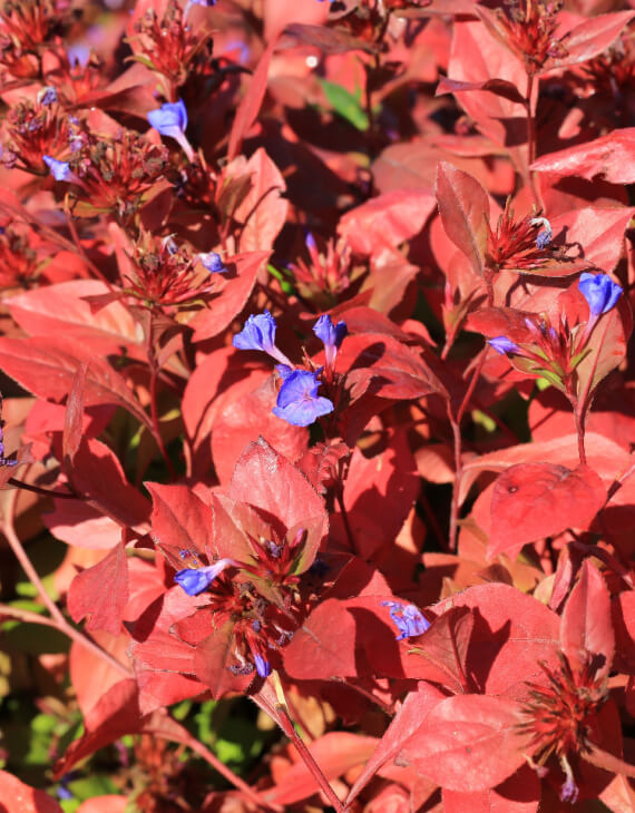 Utilisez ce Ceratostigma en bordures, en massifs ou pour agrémenter des rocailles. Son feuillage automnal spectaculaire et ses fleurs lumineuses en font un choix parfait pour prolonger l’intérêt visuel du jardin en fin de saison.