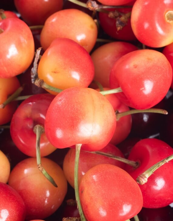 Le fruit du Cerisier Bigarreau Napoléon est une grosse cerise arrondie, légèrement cordiforme, à la peau lisse et brillante. Sa couleur jaune ambrée se nuance de rouge vif sur la face exposée au soleil, offrant un aspect bicolore très attractif. La chair, ferme et croquante, est jaune pâle, sucrée et juteuse, avec une légère pointe d’acidité qui équilibre parfaitement la saveur.