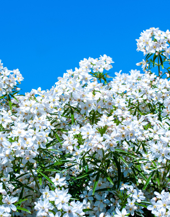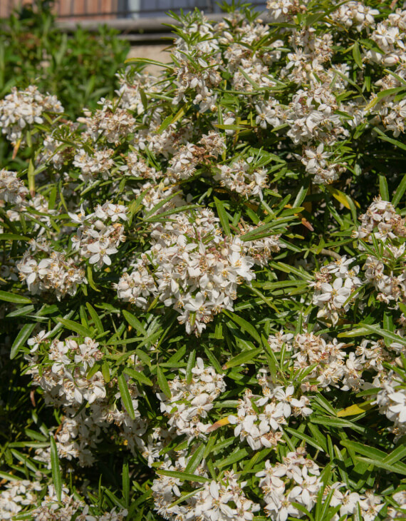 Dès le printemps, cet arbuste se pare de grappes de fleurs blanches étoilées, au parfum envoûtant d’agrume. Une seconde floraison généreuse peut survenir en automne si les conditions sont favorables. Son feuillage vert clair, finement découpé, reste attrayant toute l’année, apportant une touche de légèreté et de texture aux massifs et bordures.