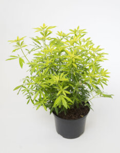 Dès le printemps, ce magnifique arbuste se couvre de petites fleurs blanches en forme d’étoiles, diffusant un parfum d’agrume envoûtant. Une seconde floraison, plus discrète, peut survenir à l’automne. Son feuillage finement découpé, d’un jaune vif, reste décoratif toute l’année, apportant une touche de lumière aux massifs, haies basses ou plantations en bacs.