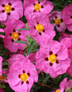 De mai à juillet, le Cistus purpureus offre une floraison spectaculaire. Ses fleurs, d’un diamètre de 8 cm environ, attirent les abeilles et favorisent la biodiversité. Chaque fleur, éphémère mais abondante, se renouvelle constamment pour un effet floral prolongé.