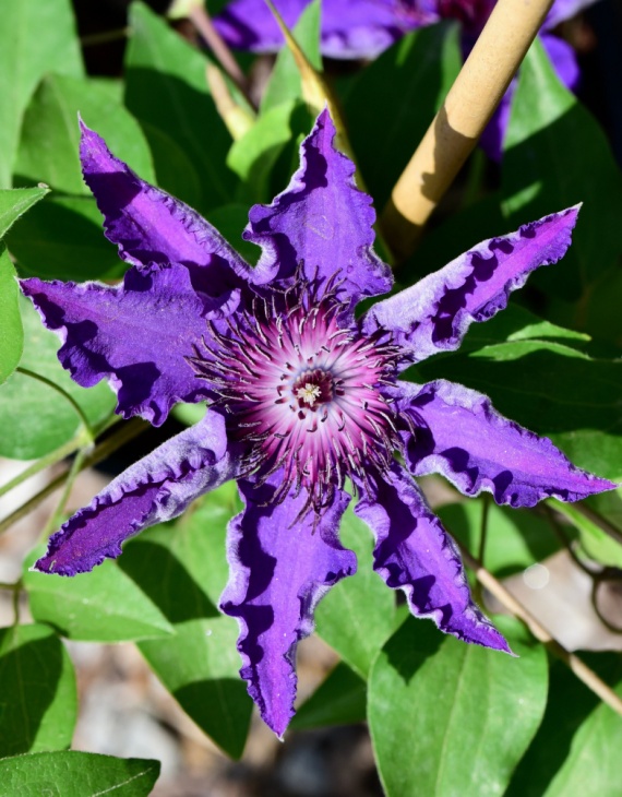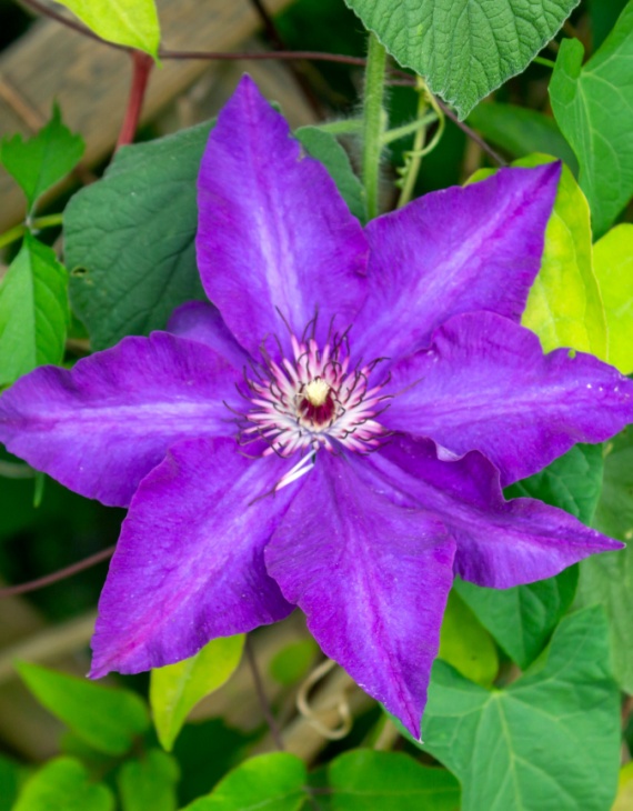 La Clematis The President produit de grandes fleurs étoilées pouvant atteindre 15 à 18 cm de diamètre. Ses pétales bleu violet profond affichent parfois de subtils reflets pourpres selon la lumière. Au centre, des étamines rouge foncé contrastent élégamment avec la teinte froide des sépales.