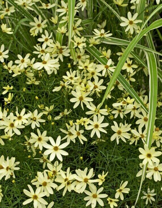 De juin jusqu’aux premières gelées, Coreopsis verticillata Moonbeam se couvre de petites fleurs étoilées jaune citron doux, portées par de fines tiges ramifiées. Chaque fleur mesure environ 2 à 3 cm de diamètre et semble flotter au-dessus du feuillage, apportant une impression de légèreté et de mouvement. Très mellifère, cette variété attire en continu les abeilles et papillons.