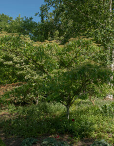 Le Cornus controversa ‘Pagoda’ se distingue par sa structure unique, avec des branches disposées en étages horizontaux, rappelant les toits superposés des pagodes asiatiques. Ce port naturel crée une silhouette majestueuse et équilibrée, idéale pour structurer un espace. Le feuillage vert foncé au printemps et en été devient jaune d’or ou pourpré à l’automne, apportant une explosion de couleurs.