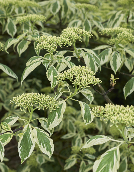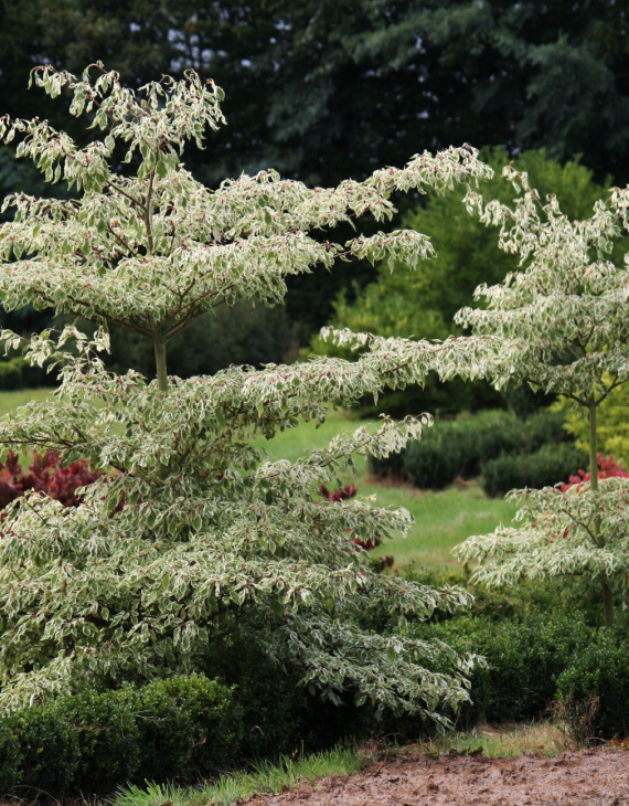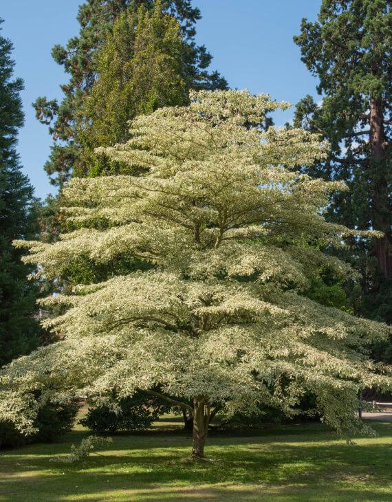 Le port étagé du Cornus controversa ‘Variegata’ rappelle les toits superposés des pagodes asiatiques, lui conférant une allure unique et sculpturale. Le feuillage caduc vert tendre bordé de blanc crème illumine le jardin au printemps et en été. À l’automne, les feuilles se parent de nuances dorées, apportant une transition saisissante avant leur chute. L’hiver met en valeur l’élégance des rameaux nus, qui conservent leur attrait dans le paysage.