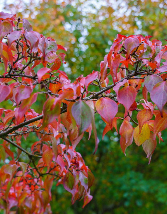 Son feuillage caduc, vert tendre au printemps et en été, évolue en automne vers des teintes flamboyantes de rouge, orange et pourpre. Avec une hauteur de 4 à 7 mètres et une largeur similaire, ce cornouiller offre une présence majestueuse dans les jardins de taille moyenne à grande.