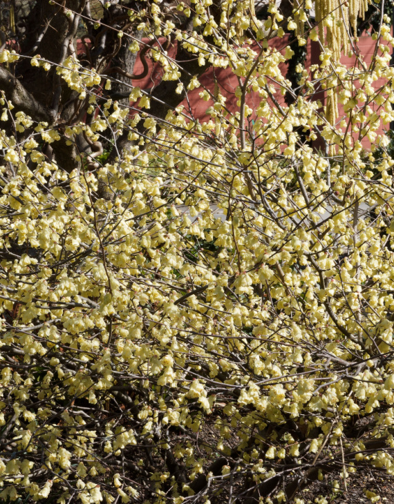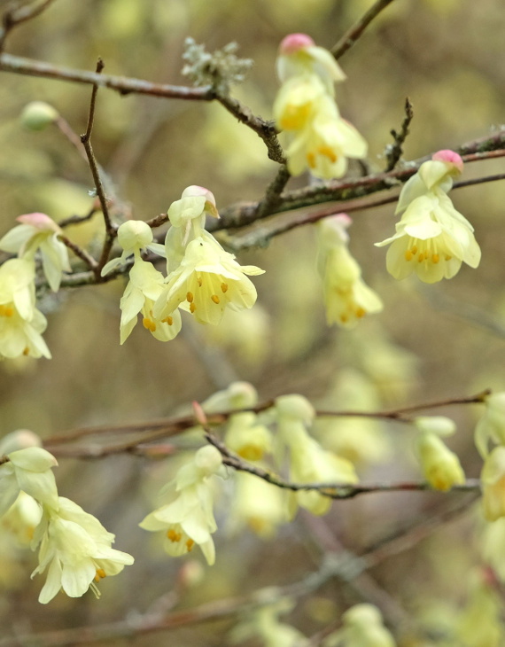 La floraison du Corylopsis pauciflora débute dès la fin de l’hiver ou le début du printemps, généralement en mars-avril. De petites grappes pendantes de fleurs jaune pâle, légèrement parfumées, s’épanouissent sur les rameaux nus, illuminant le jardin en période froide. Une fois la floraison terminée, le feuillage caduc vert tendre prend le relais, offrant une texture douce et raffinée.