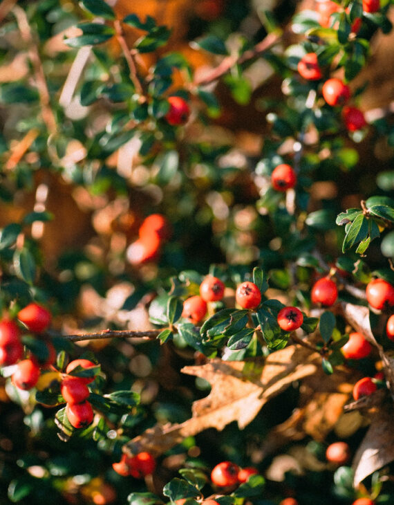 Son feuillage persistant, composé de petites feuilles vert foncé brillantes, reste attrayant toute l’année. Au printemps, de petites fleurs blanches, discrètes mais mellifères, apparaissent et attirent les pollinisateurs. En automne, ces fleurs laissent place à des baies rouge vif, très décoratives, qui persistent souvent tout l’hiver, offrant à la fois une touche colorée au jardin et une ressource alimentaire pour les oiseaux.