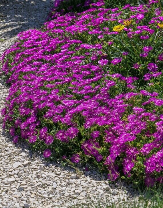 Le Delosperma cooperi, communément appelé pourpier vivace, ficoïde vivace ou pourpier des rochers, est une plante succulente originaire d’Afrique australe. Appartenant à la famille des Aizoacées, cette vivace couvre-sol séduit par son feuillage charnu persistant et sa floraison spectaculaire tout l’été. Très résistante à la sécheresse et au gel modéré, elle est idéale pour les rocailles, talus, bordures ensoleillées ou jardinières en plein soleil.