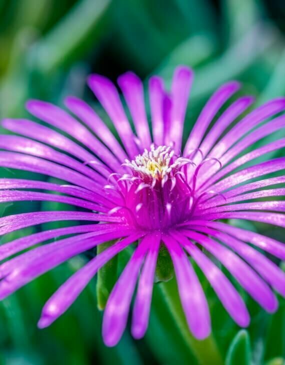 De mai à septembre, parfois même jusqu’aux premières gelées, le Delosperma cooperi produit une profusion de fleurs magenta à rose fuchsia, en forme de marguerites plates. Ces fleurs, nombreuses et brillantes, s’ouvrent au soleil et se referment par temps couvert. Leur éclat exceptionnel attire immédiatement l’attention et illumine les espaces les plus arides.