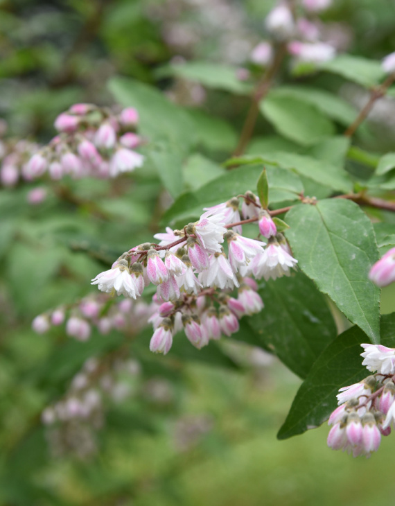 Le Deutzia scabra ‘Plena’ se distingue par ses fleurs blanches légèrement teintées de rose, qui forment des grappes généreuses et retombantes. Ces fleurs parfumées apparaissent entre mai et juin, offrant un spectacle enchanteur au jardin. Le feuillage caduc, d’un vert vif, met en valeur cette floraison lumineuse tout en apportant un contraste harmonieux.