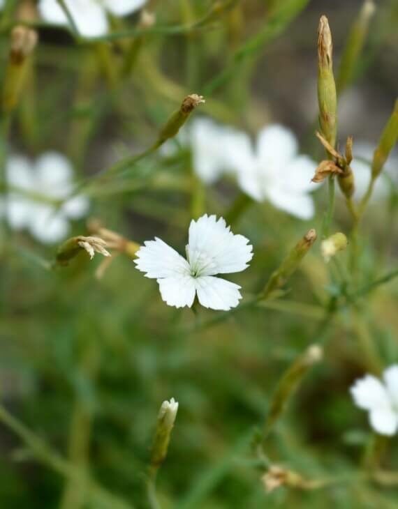 Entre juin et août, Dianthus deltoides ‘Albiflorus’ produit une myriade de petites fleurs simples, blanc pur, portées sur des tiges fines de 20 à 30 cm de hauteur. Contrairement à d’autres variétés d’œillets mignardises, les fleurs sont plus discrètes mais nombreuses, apportant fraîcheur et légèreté dans les massifs. Cette floraison lumineuse attire les pollinisateurs, notamment les abeilles et les papillons.