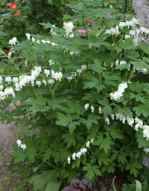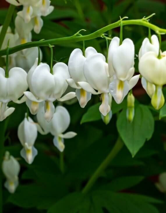 De mai à juin, le Dicentra spectabilis ‘Alba’ développe de longues hampes florales arquées ornées de fleurs en forme de cœur blanc, pendantes, évoquant des pendentifs précieux. Cette floraison aérienne, pure et délicate, est non parfumée, mais son attrait visuel est indéniable. Elle se détache magnifiquement sur le feuillage vert clair, finement découpé, qui apporte une texture légère au jardin.