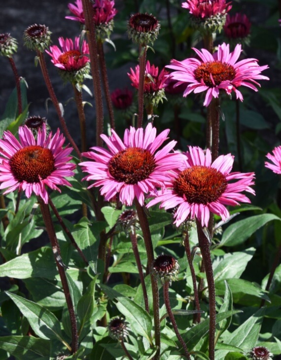 De juillet à septembre, Fatal Attraction produit des capitules pourpres au disque central brun cuivré, entourés de pétales bien droits, légèrement tombants. Leur couleur saturée se marie parfaitement avec les tiges d’un violet très foncé, presque noir. Ces fleurs, bien portées au-dessus du feuillage, conservent une allure soignée même en fin de floraison. Compacte et dense, cette variété est idéale en fleurs coupées, et sa floraison attire une multitude d’abeilles et de papillons.