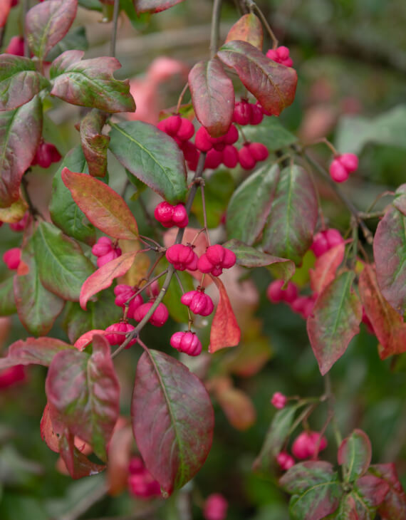 Les fruits en capsules rose vif, qui apparaissent en automne, s’ouvrent pour révéler des graines orange vif. Ces baies originales, appelées aussi « bonnets d’évêque », apportent une touche unique et attirent les oiseaux, contribuant ainsi à la biodiversité du jardin.