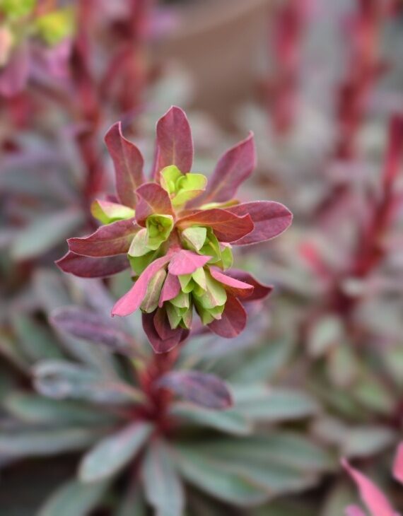 Dès l’hiver, ses rosettes basales offrent un spectacle élégant avec leurs tons pourpres et bordeaux, apportant de la structure et de la couleur aux coins du jardin souvent laissés en retrait. À partir de mars, l’Euphorbe ‘Purpurea’ émet des tiges érigées surmontées de bractées chartreuses très lumineuses, contrastant harmonieusement avec le feuillage sombre. Cette floraison aérienne dure jusqu’au début de l’été, attirant les insectes pollinisateurs et structurant les massifs ombragés.