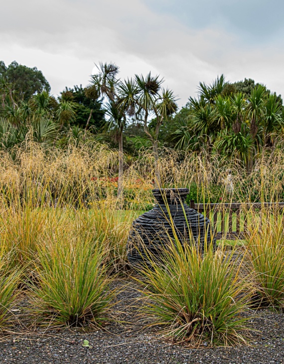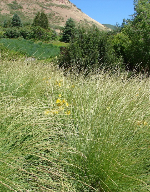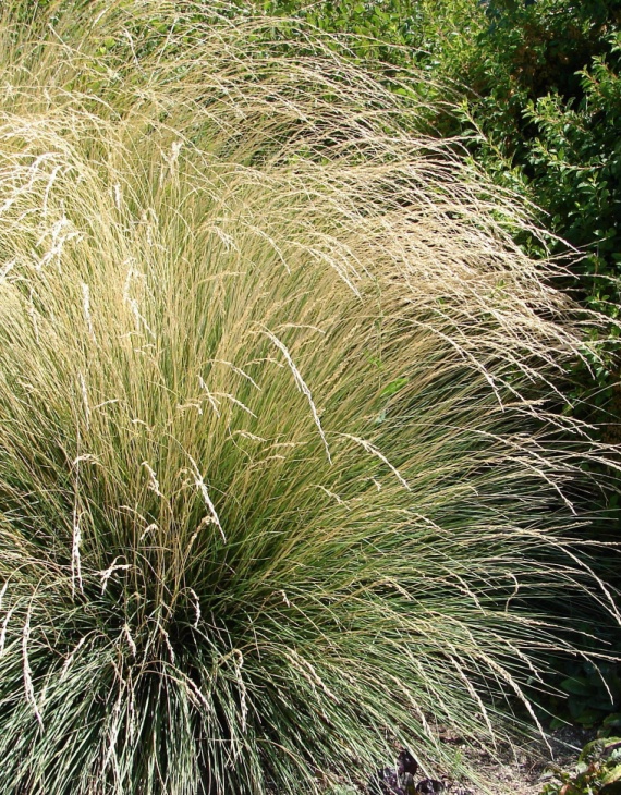 En été, elle produit de fines hampes florales dressées, d’un beige paille délicat, portées bien au-dessus du feuillage. Ces inflorescences apportent une texture légère et mouvante au jardin. Bien que la floraison ne soit pas l’atout principal de cette graminée, elle ajoute une touche aérienne appréciable et prolonge son attrait visuel.