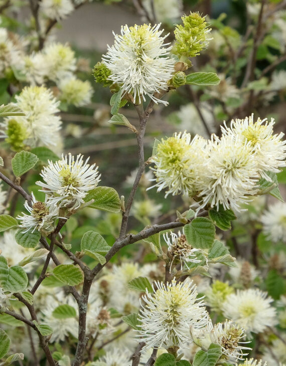 La Fothergilla major, également appelée « Fothergilla à grandes feuilles », est un arbuste ornemental apprécié pour son feuillage spectaculaire et ses fleurs parfumées. Originaire des États-Unis, cet arbuste caduc est un choix parfait pour les jardins qui recherchent des couleurs flamboyantes en automne et une floraison délicate au printemps.