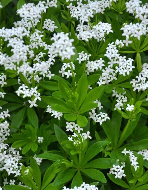 En avril-mai, Galium odoratum se couvre d’une myriade de petites fleurs blanches étoilées, qui forment un élégant contraste avec son feuillage clair. Ces fleurs mellifères sont une source de nectar pour les insectes pollinisateurs, et apportent une touche délicate et lumineuse aux recoins ombragés.