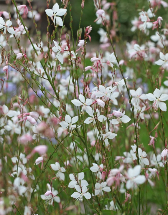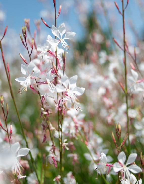De mai à octobre, Gaura lindheimeri offre une floraison spectaculaire, sous forme de petites fleurs étoilées blanches ou rosées, portées sur de longues tiges fines et souples. Les fleurs évoquent des papillons en vol, qui dansent au gré du vent. Cette floraison abondante et continue en fait une vivace incontournable pour tous les jardins ensoleillés.