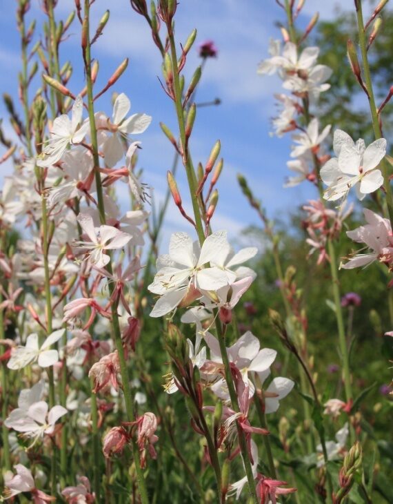 La Gaura ‘Whirling Butterflies’ offre une floraison continue de mai à octobre, sous forme de fleurs blanches légèrement rosées en bouton, s’épanouissant en étoiles délicates. Les inflorescences s’élèvent au-dessus d’un feuillage étroit vert à rougeâtre, créant une silhouette très aérienne. En sol bien drainé, même pauvre, elle ne cesse de fleurir tout l’été sans nécessiter de soins particuliers.