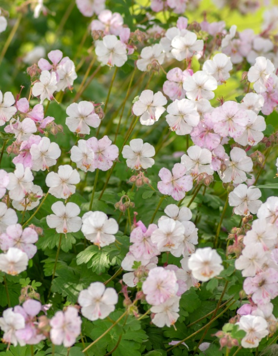 Le Geranium cantabrigiense ‘Biokovo’ offre une floraison abondante et raffinée. De mai à juillet, il se couvre de petites fleurs blanches légèrement teintées de rose, portées par de fines tiges. Ce contraste doux entre le feuillage vert vif et les fleurs délicates illumine les massifs, rocailles et bordures. En automne, son feuillage caduc à semi-persistant vire au rouge bronze, prolongeant son intérêt décoratif.