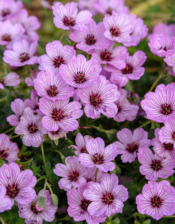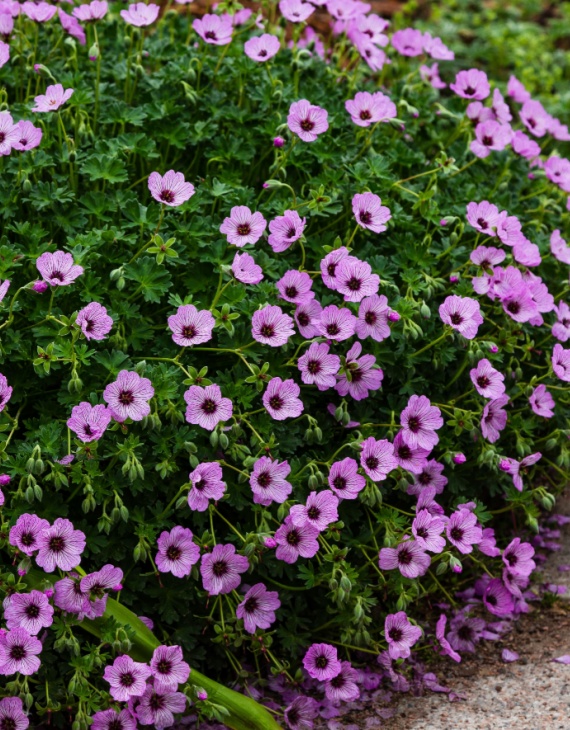 Le Geranium cinereum ‘Ballerina’ se distingue par ses fleurs d’un rose violacé tendre, marquées de veines pourpres profondément dessinées. Le centre sombre des fleurs ajoute une profondeur remarquable à son éclat. La floraison, abondante et prolongée de mai à août, illumine les rocailles, bordures et murets.