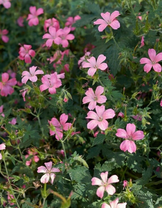 Le Geranium endressii offre une profusion de fleurs roses éclatantes, parfois marquées d’un cœur plus foncé, qui illuminent les massifs de mai jusqu’aux premières gelées. Chaque fleur, portée par une fine tige dressée, contraste joliment avec le feuillage vert vif et découpé, dense et décoratif.