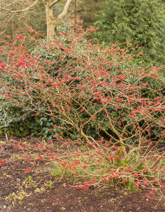 L’Hamamelis x intermedia ‘Diane’, appelé aussi noisetier des sorcières, est un arbuste caduc à la floraison hivernale spectaculaire. Cet hybride entre Hamamelis mollis et Hamamelis japonica se distingue par ses fleurs rouge cuivré, épanouies de janvier à mars. Leurs pétales fins et frisés dégagent un parfum doux et agréable, attirant les premiers pollinisateurs de l’année.