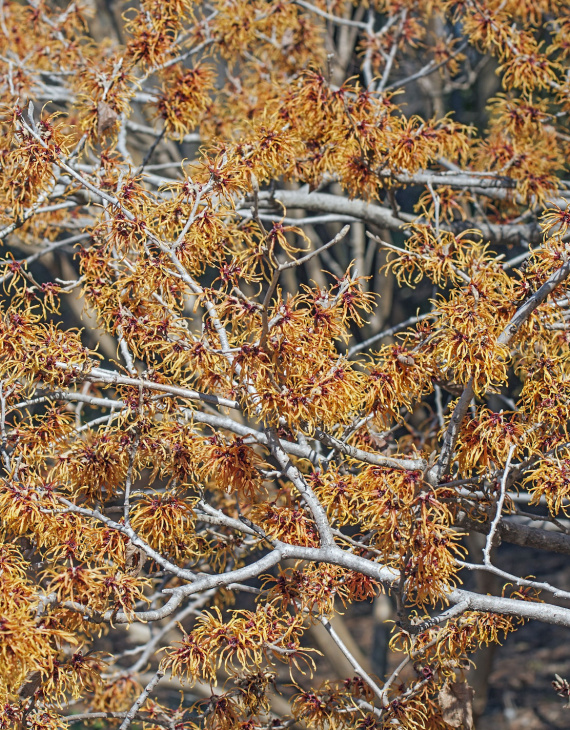 L’Hamamelis x intermedia ‘Jelena’, appelé aussi noisetier des sorcières, est un arbuste caduc remarquable pour sa floraison hivernale unique. Ses fleurs, d’un orange cuivré intense, apparaissent de janvier à mars et répandent un parfum léger et agréable. Leurs pétales longs et frisés ajoutent une touche d’élégance à tout jardin en hiver.