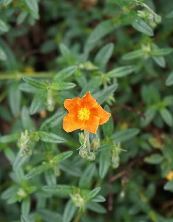 Le Helianthemum ‘Bronzeteppich’ forme rapidement un tapis dense et étalé de tiges rampantes portant un feuillage étroit, gris-vert à reflets cuivrés. Son nom, signifiant littéralement « tapis de bronze », traduit parfaitement l’aspect décoratif de son feuillage toute l’année, même en hiver dans les climats doux.