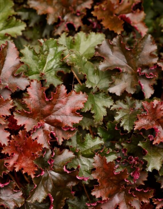 L’Heuchera ‘Chocolate Ruffles’ est une plante vivace au feuillage ornemental spectaculaire, offrant des nuances chocolat profond et pourpre métallisé qui se déclinent avec élégance tout au long de l’année. Cette variété, issue de sélections horticoles minutieuses, séduit par la forme très découpée de ses feuilles, presque dentelées, aux reflets satinés, et leur revers pourpre intense, d’où son nom évocateur de Ruffles (volants). Compacte, rustique et facile à vivre, cette heuchère est idéale pour composer des scènes contrastées, en massif, bordure ou potée.