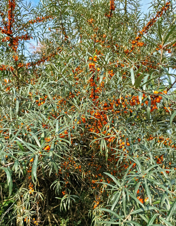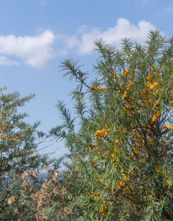 L’Hippophae rhamnoides, communément appelé argousier, est un arbuste caduc au feuillage argenté qui illumine les jardins. Il porte des épines par endroit. À l’automne, il se pare de baies orange éclatantes, riches en vitamine C et en antioxydants. Ces fruits acidulés sont utilisés en cuisine pour préparer jus, confitures et sirops, mais ils servent aussi de nourriture pour la faune locale, notamment les oiseaux. L’argousier est une plante dioïque, il y a des pieds mâle et des pieds femelle.