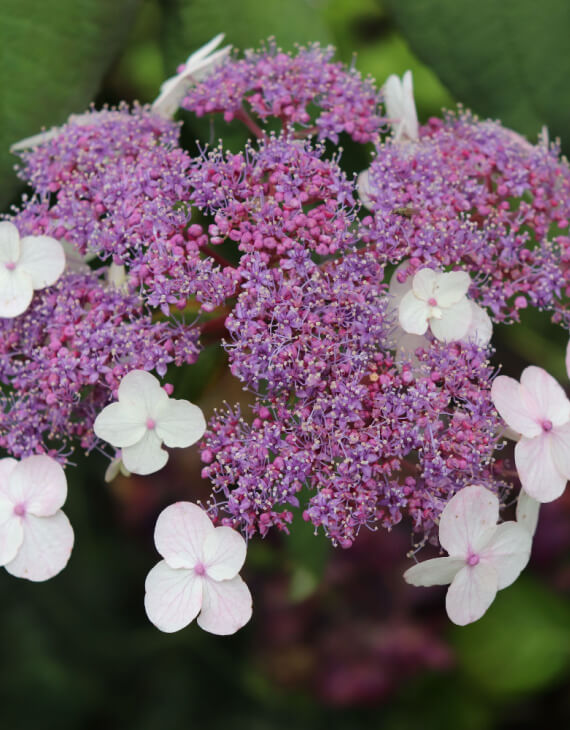 L’Hydrangea aspera ‘Macrophylla’, aussi appelé hortensia du Tibet à grandes feuilles, est un arbuste caduc au port ample et élégant. Il se distingue par son feuillage luxuriant et velouté, ainsi que par ses superbes inflorescences plates qui associent des petites fleurs fertiles violettes au centre, entourées de fleurs stériles aux pétales rose pâle à lavande.
