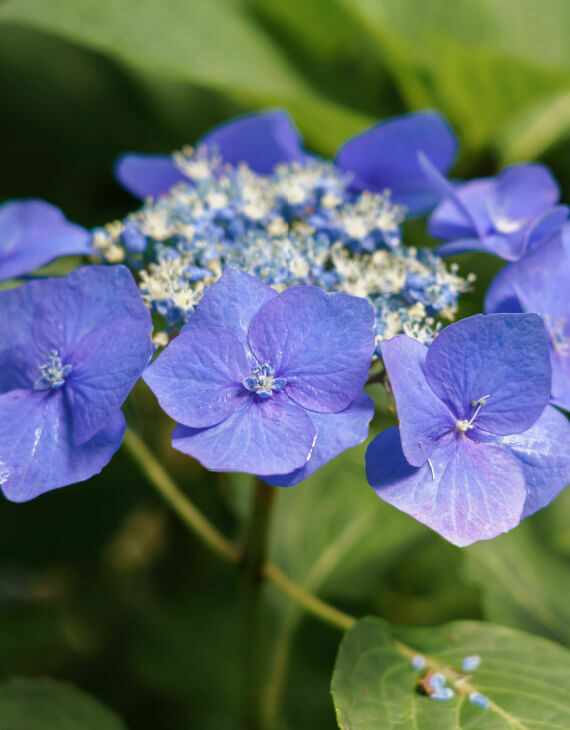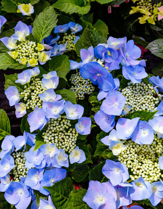 L’Hydrangea macrophylla ‘Teller Blue’, plus connu sous le nom d’hortensia bleu, est un arbuste caduc prisé pour ses superbes inflorescences en larges ombelles plates d’un bleu intense. Cette variété fait partie des hortensias à fleurs plates (lacecap), où un cœur de petites fleurs fertiles est entouré de plus grandes fleurs stériles, formant un contraste élégant et raffiné.